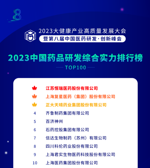 由药智网、中国药业杂志社主办的2023大健康产业高质量发展大会暨第八届中国医药研发•创新峰会于6月16日开幕,会上发布了《2023中国药品研发实力排行榜》系列榜单,金年会- 金字招牌医药凭借深厚的创新研发实力再创辉煌:荣登《2023中国药品研发综合实力排行榜TOP100》榜首、《2023中国化药研发实力排行榜TOP100》榜首。值得一提的是,今年是金年会- 金字招牌医药连续第6年入选《中国药品研发综合实力排行榜》榜首。